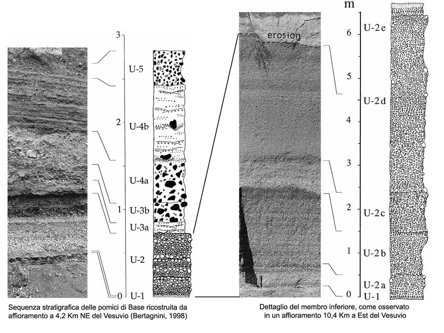 I depositi dell’eruzione delle Pomici di Base sono stati suddivisi, dal punto di vista stratigrafico, in un membro inferiore, originato dalla prima e dalla seconda fase dell'eruzione, e un membro superiore, originato dalla terza fase (Bertagnini et al., 1998).